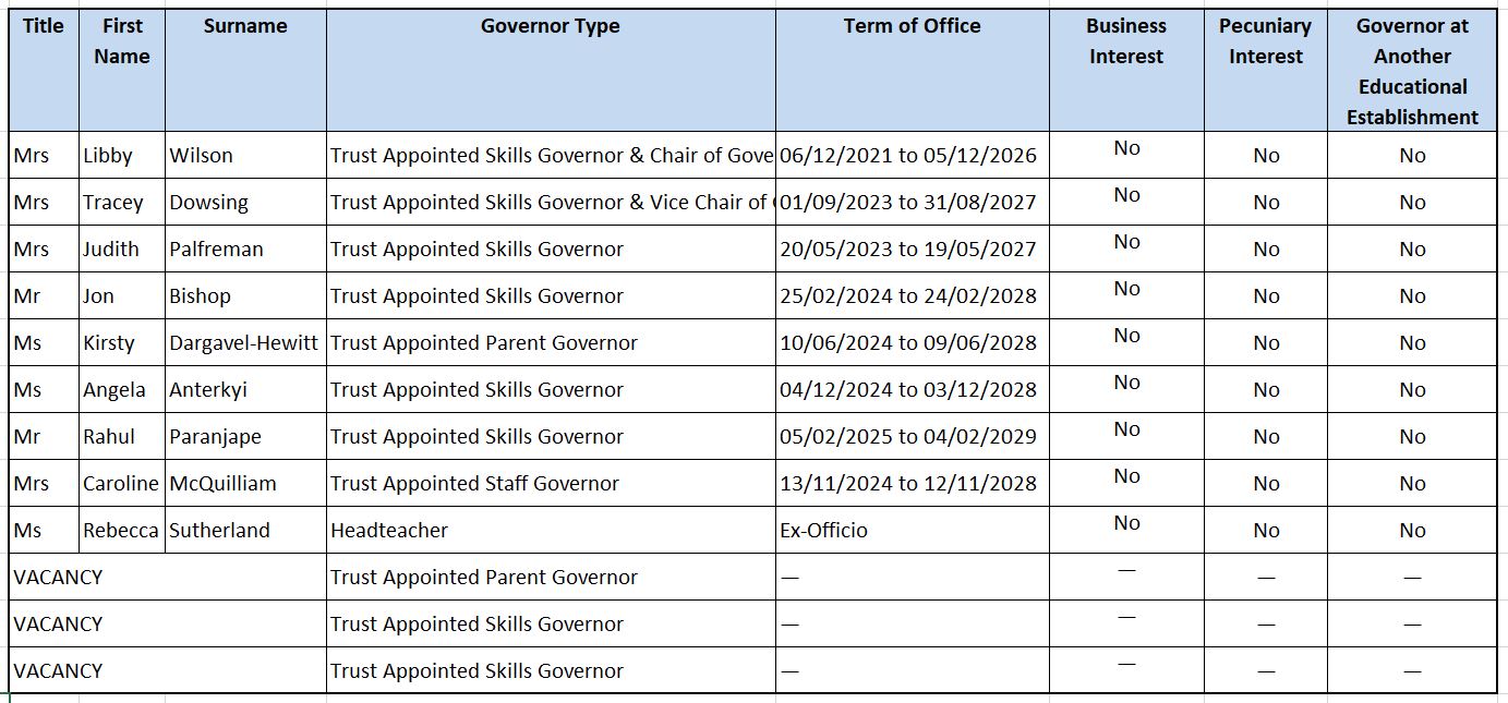 Please note the register of Governors' interest is currently being updated, please contact school directly in the meantime for a copy.